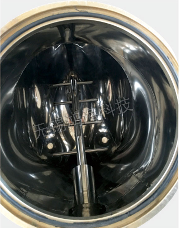 混料筒一般用不銹鋼制作,內外壁拋光,結構設計上保證無積料死角,清洗方便徹底。筒體上部有兩個進料口,下部有一個出料口。桶體可用手任意轉動,以便于出料。如用戶需其它材料可在訂貨時提出。